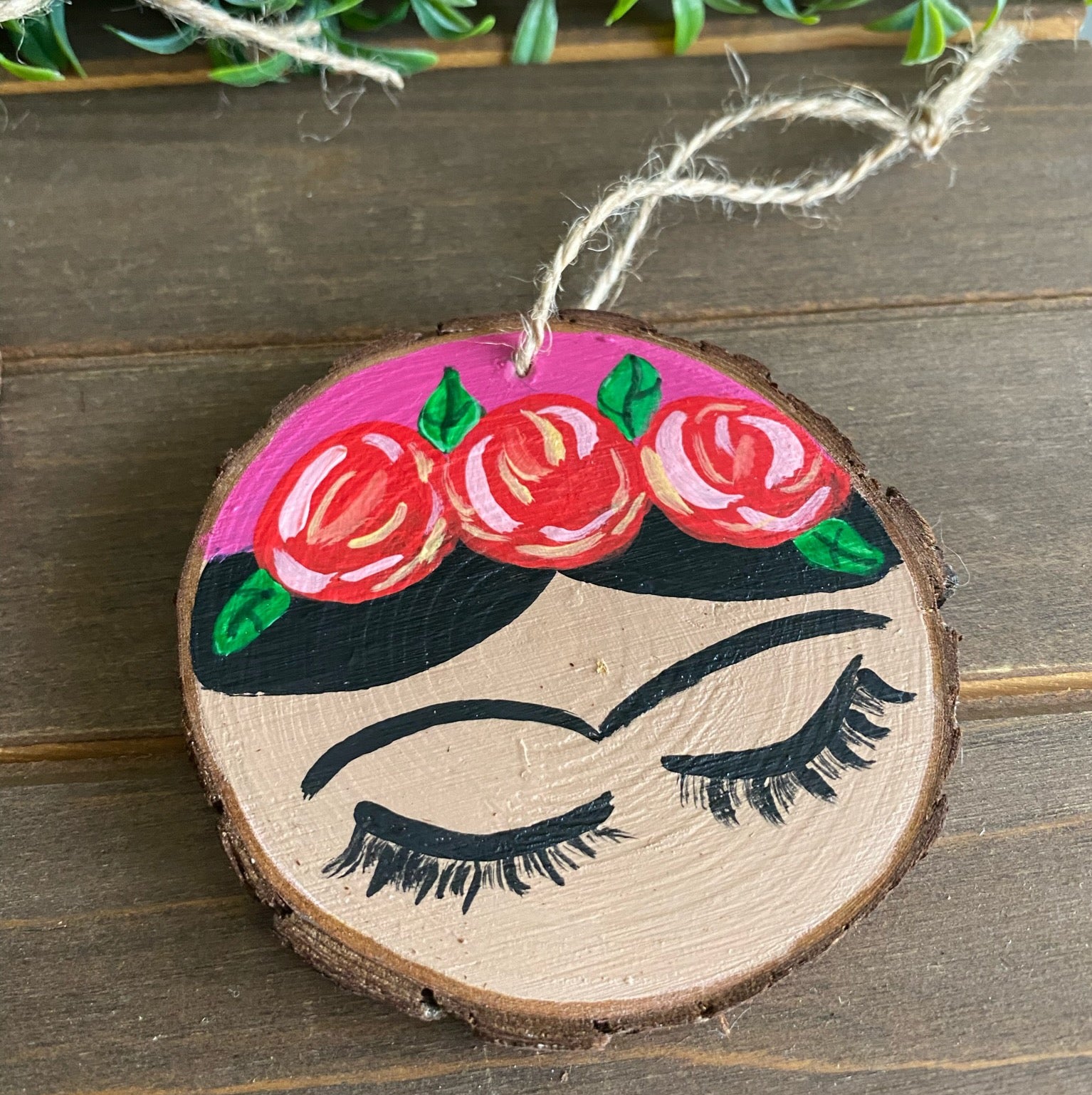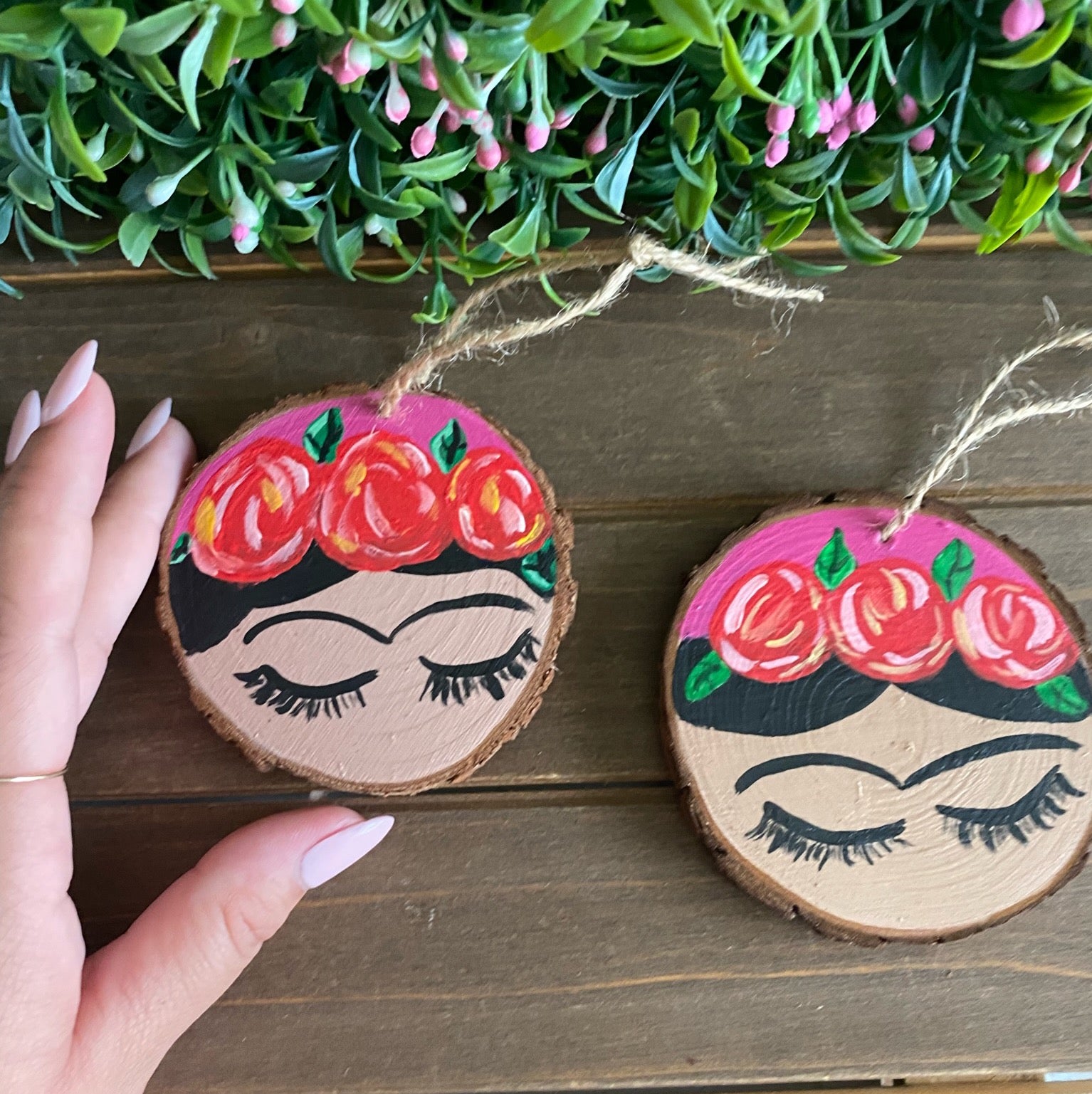 Painted Frida-inspired on a 3.5inch-4 inch wood round using acrylic paint