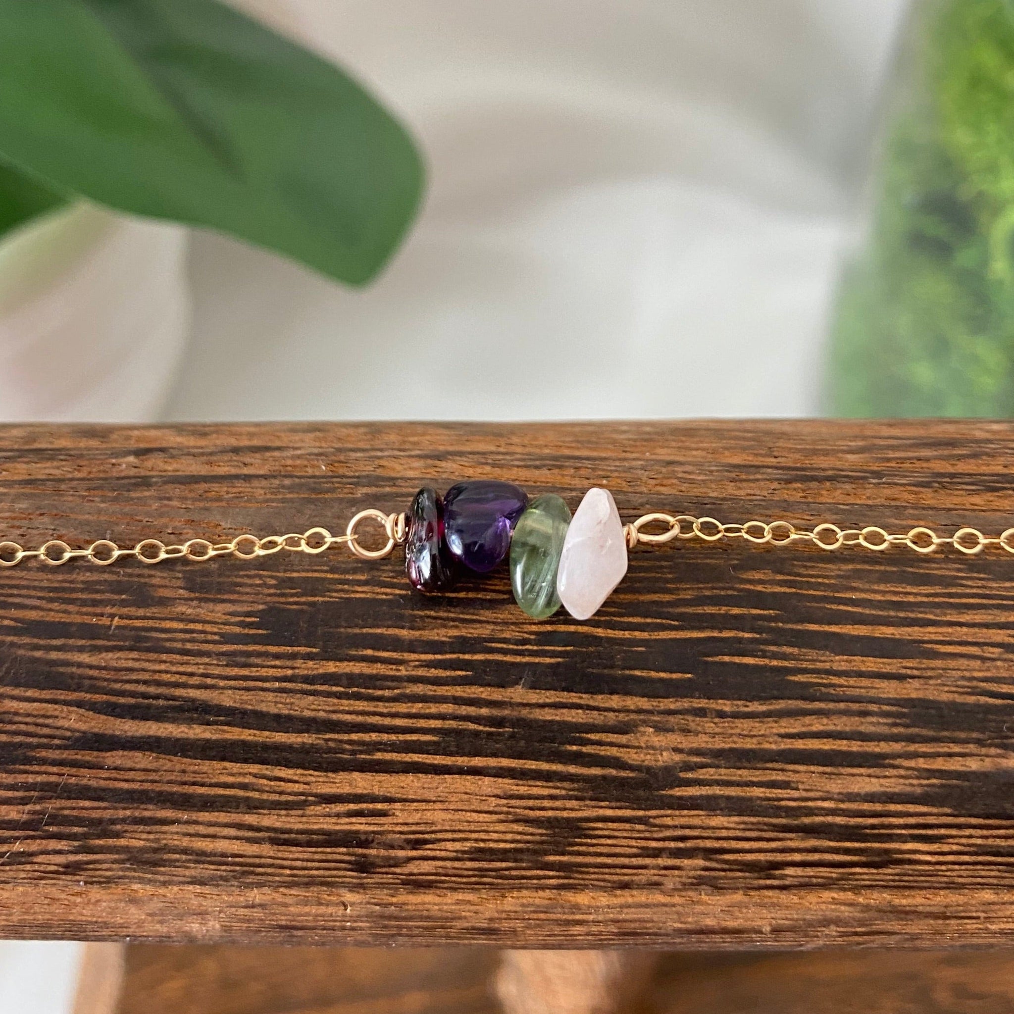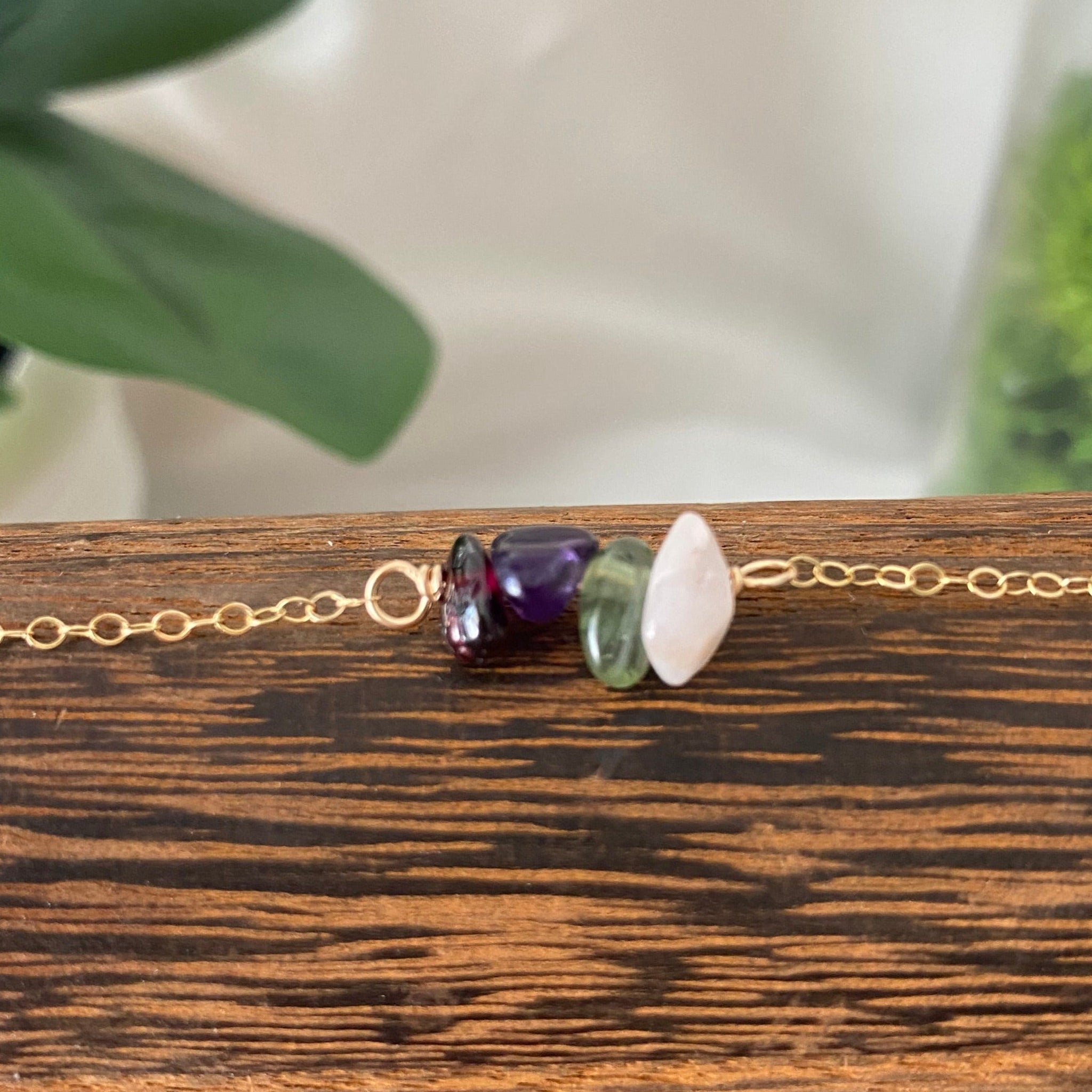 The Aquarius Gemstone Zodiac Bracelet features garnet, amethyst, peridot, and rose quartz.
